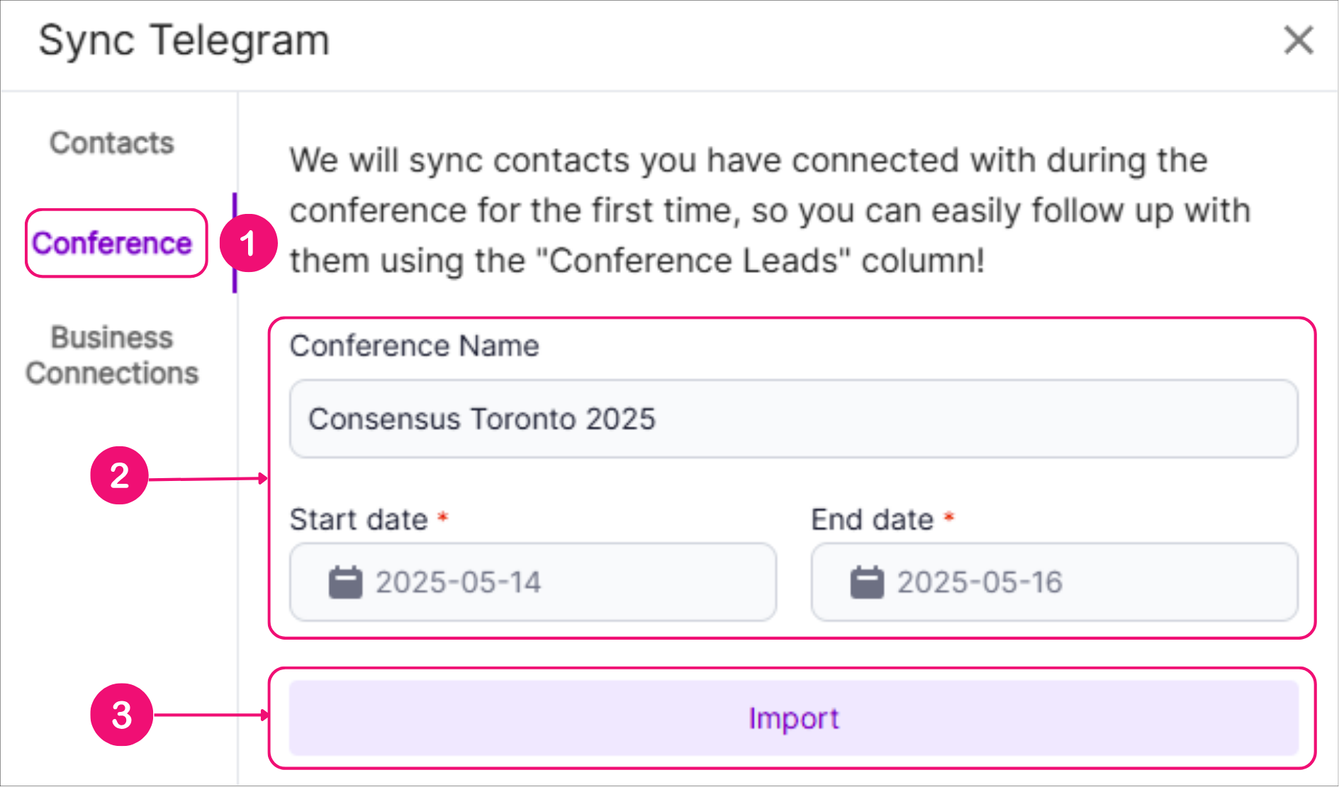 Before or after the conference, streamline your event outreach by setting up a tag like ‘Token2049’ or ‘Consensus Toronto’ in Sync Telegram > Conference under Integrations. Specify the event’s start and end dates, and during that time frame, any new Telegram conversation you initiate will automatically be tagged with the conference name. This makes it easy to segment conversations and ensures seamless follow-up — you'll find the tag conveniently listed in the Contacts tab afterward.